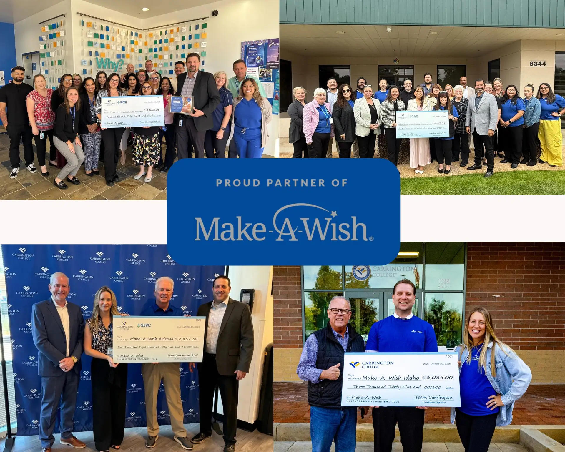 In September, Carrington College and SJVC united for an institution-wide digital fundraiser benefiting Make-A-Wish®. Students, faculty, and staff across all campuses came together to raise funds and awareness to help grant life-changing wishes for children facing critical illnesses. The fundraiser raised more than $19,709 from over 749 donors. SJVC and Carrington College’s owners, the Perry Family, generously donated an additional 10K to get the institutions to their 30K goal. This milestone event strengthened our growing partnership and demonstrated the impact we can make when we act together. Our Visalia, Phoenix, Temecula, and Boise campuses raised the most funds for their regions. They were able to present checks to their local chapters to conclude the digital fundraiser.